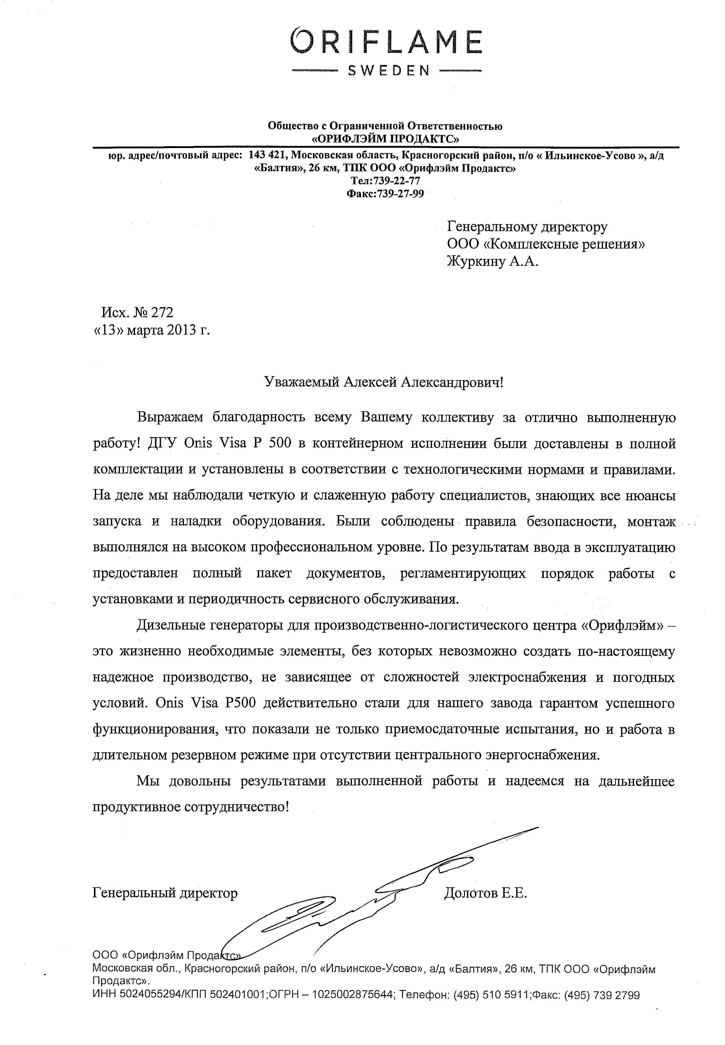 Александр Иванов, ведущий маркетолог Орифлейм: "Компания GENERENT является одним из самых надежных наших партнеров. Они показали профессионализм и ответственное отношение к обязательствам по договору - все монтажные и пуско-наладочные работы были выполнены точно в указанный срок. ДГУ работают отлично – уже использовались нами при нештатных ситуациях. Мы получили уверенность в завтрашнем дне, и рады выразить благодарность за отличную работу!".